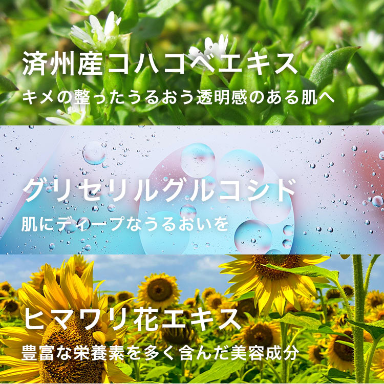 肌のバリア機能をサポートする済州産コハコベエキス※1や肌の水分の通り道アクアポリンをサポートするグリセリルグルコシド※2を配合。